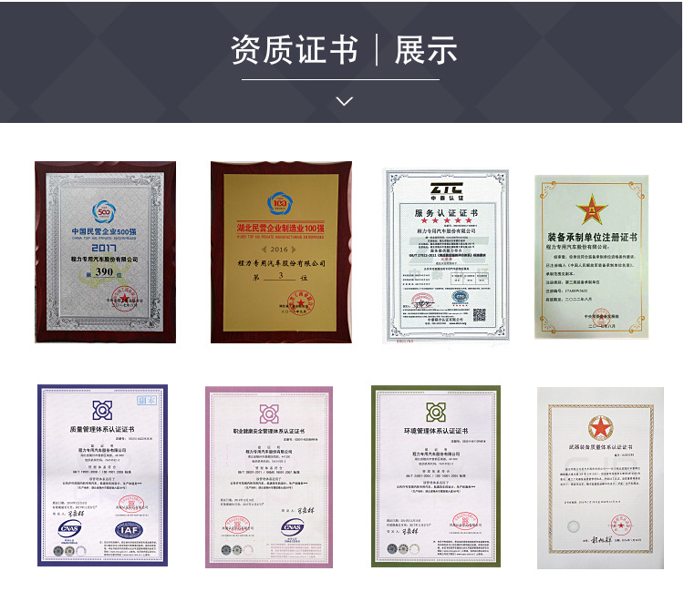 產品質量穩定,經營方式靈活,公司現已全面通過ISO9001-2008 國際質量體系認證、3C國際強制產品認證,并通過出口產品的各項認證。“程力威”產品有680多個品種上國家公告目錄,其中有不少的車型如灑水車、垃圾車、吸污車、吸糞車等環衛系列車型享受國家免車輛購置稅優惠條件。