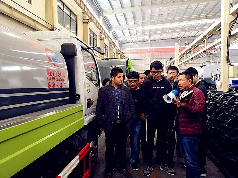 程力環(huán)衛(wèi)車標(biāo)準(zhǔn)化廠王成廠長(zhǎng)向?qū)W員們講解程力新標(biāo)準(zhǔn)水車的生產(chǎn)工藝流程。