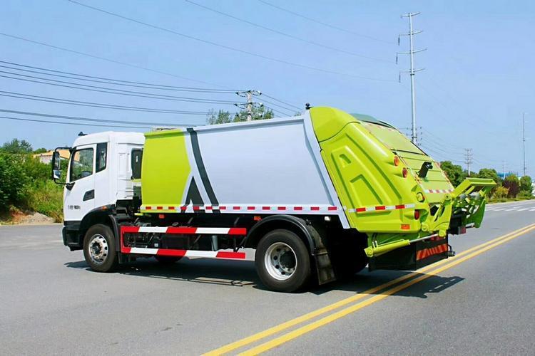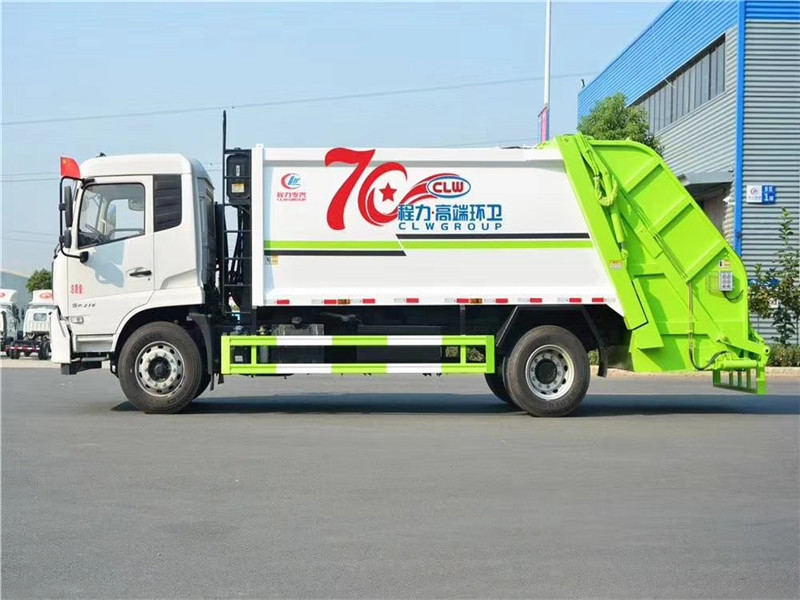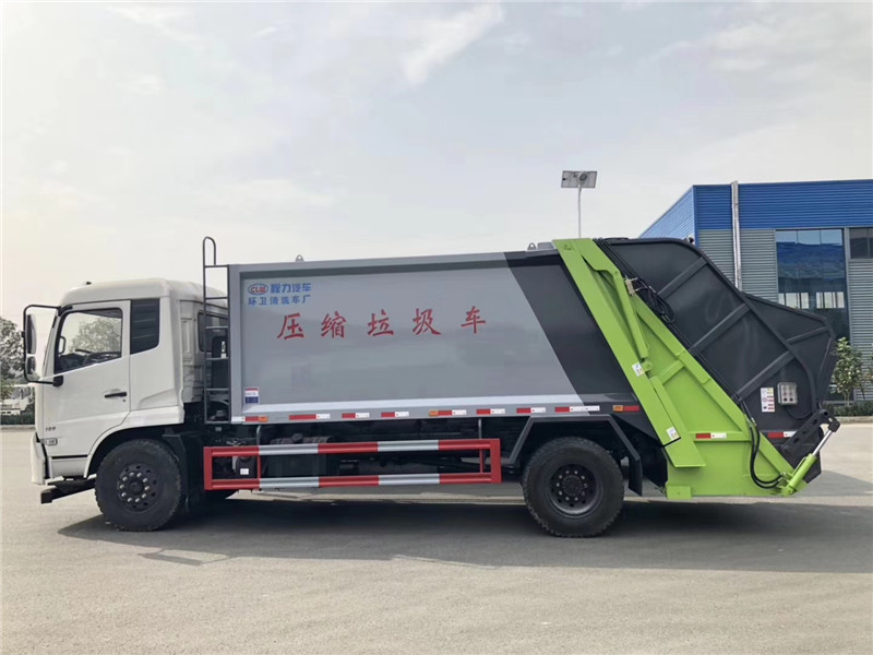 專用部分主要技術特點及產品描述: 1.垃圾箱:采用加強梁和鋼板焊接而成牢固的框架結構,實際容積最大為12-14立方,外形美觀,重量輕, 受力好,不變形;推鏟由鋼管骨架和折面板構成,不僅結構輕巧,又能使垃圾均勻分布,卸料干凈徹底;填裝器主要由填裝器殼體、滑板、刮板等構件組成,各構件采用受力良好的梁板或箱型結構,結構牢固,重量輕;為了提高使用壽命,對箱體進行了磷化防銹處理,并噴涂防銹底漆。2.液壓系統:利用電控和液壓控制的優點,通過控制轉換,保證了各機構動作準確可靠,提高了使用可靠性和效率;采用了先進的液壓舉升安全回路。其原理是在液壓系統中的舉升油缸上設置了單向平衡閥。該閥隔斷了舉升油缸與液壓膠管的直接連接,即使油管爆裂,填裝器也不會突然落下造成惡性事故,提高了使用安全性。3.裝卸方式:箱體尾部翻轉架帶翻桶(斗)機構裝卸,不會對操作人員造成污染。4.垃圾箱與填裝器之間采用特制橡膠條密封,密封性好,杜絕了二次污染。 湖北程力汽車國六東風天錦12-14方壓縮垃圾車多方位圖片展示: