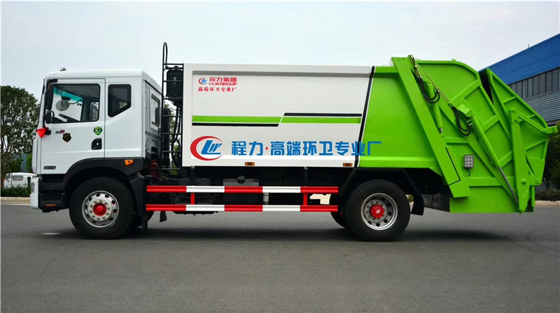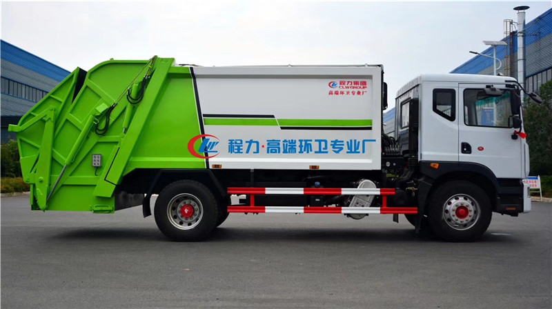 4、智能操作系統采用西門子PLC一鍵循環,駕駛室內與車外均有電控操作盒,后尾部左右各帶一個操作盒。駕駛室室內卸料時操作,外部裝料時操作,另帶有一套手動應急操作,同時設有電子自動油門,不在需要人工加減油門來調節工作速度,一個司機就可以完成全部操作,也可減少或避免野蠻加油而導致液壓系統故障。 湖北程力汽車壓縮垃圾車國六東風D9壓縮垃圾車多方位圖片展示: