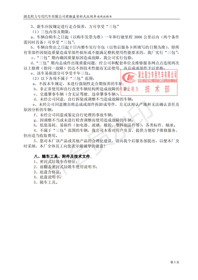 湖北程力密封自卸垃圾車使用維護說明書(程力自卸垃圾車如何使用