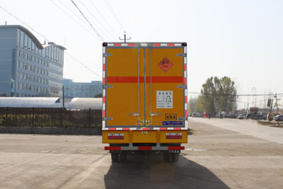 運輸品名:炸藥,雷管,煙花爆竹等,類項號:1.1B,1.1D,1.1G,1.2G,1.3G,1.4G 等。廂體頂部封閉不可開啟,側(cè)、后防護裝置材料材質(zhì)為Q235A碳鋼,側(cè)防護與箱體底部焊接連接,后防護裝置與車架采用焊接連接,后防護截面尺寸(mm):100×50,離地高度為450mm。該車隨底盤選裝駕駛室,選裝側(cè)面開門。僅選用發(fā)動機型號: ISB3.9-125E40A、YC4E140-42對應(yīng)的油耗值分別為(L/100km): 18.83、19.39。安裝前輪盤式制動器,安裝子午線輪胎和帶ABS的底盤。安裝帶有衛(wèi)星定位功能的行駛記錄儀。ABS系統(tǒng)生產(chǎn)廠家/型號:東風電子科技股份有限公司汽車制動系統(tǒng)公司/36BG13-30010。 |