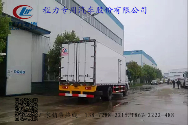 2.上裝配置:冷藏廂體內部有效尺寸:長7.4米×寬2.3米×高2.4米,廂體蒙皮采用內外玻璃鋼,隨客戶選擇內置槽鋼焊接骨架或者玻璃纖維超輕高強度骨架,填充8cm聚氨酯保溫層,不銹鋼包角,不銹鋼門框,不銹鋼門鎖件,防滑花紋鋁底板,配后雙開門,車廂右側可以加開側門,-5度或者-18度非獨立制冷機組,可選裝合資獨立制冷機組或美國原裝進口獨立制冷機組。選裝底板通風槽,選裝導軌肉鉤。