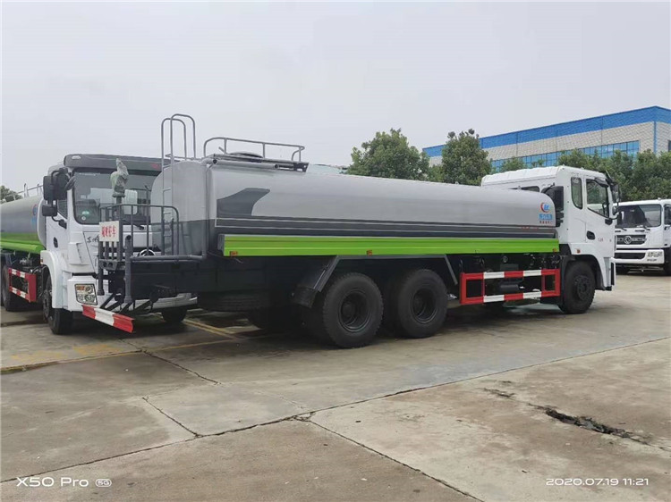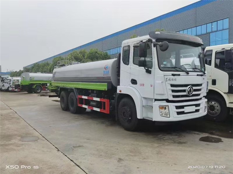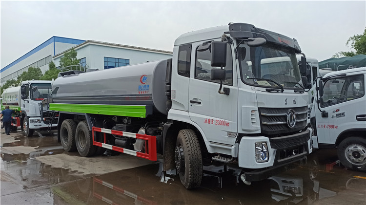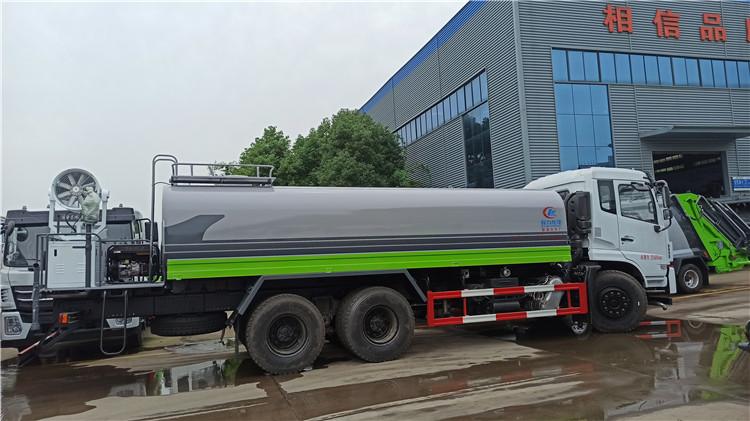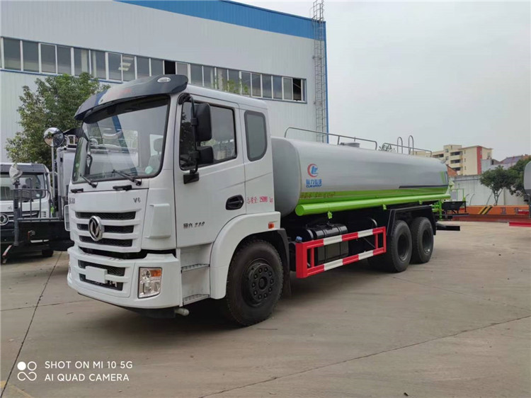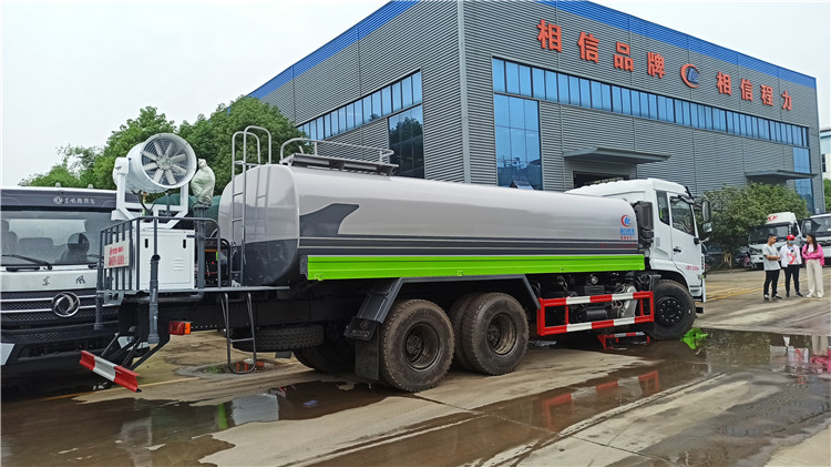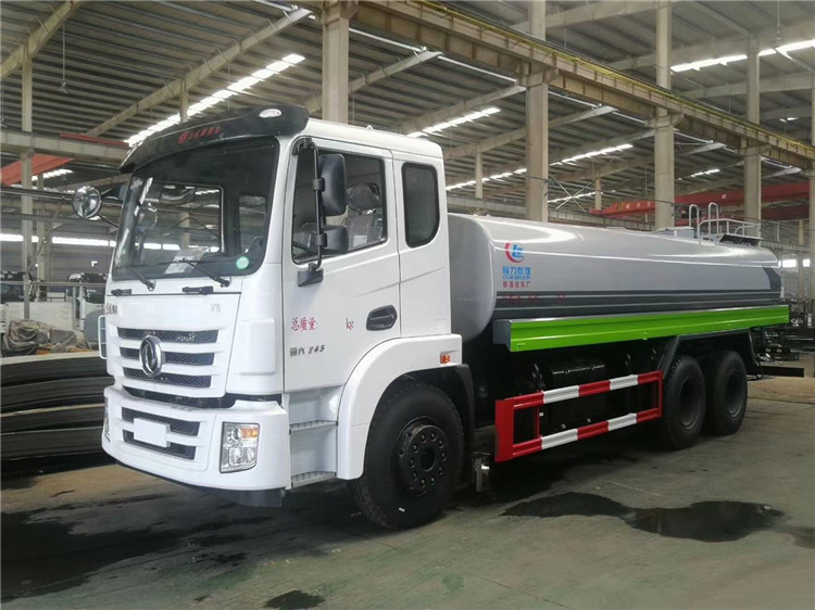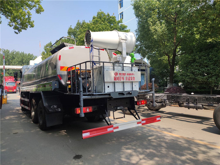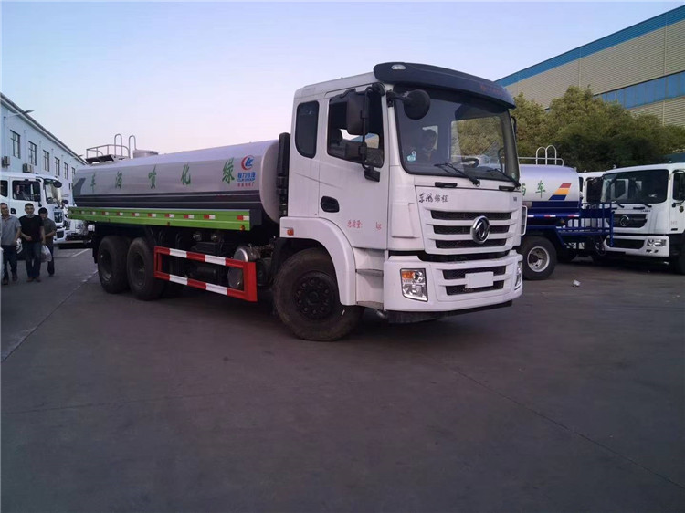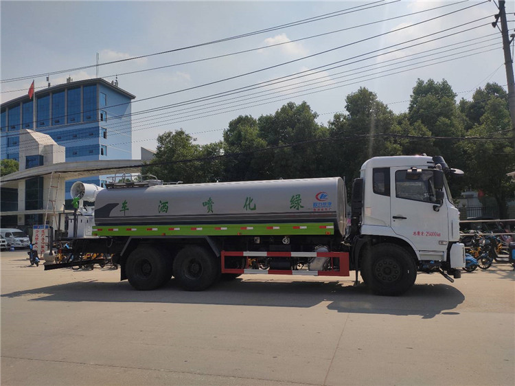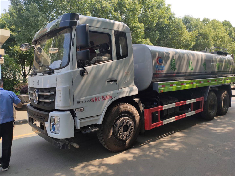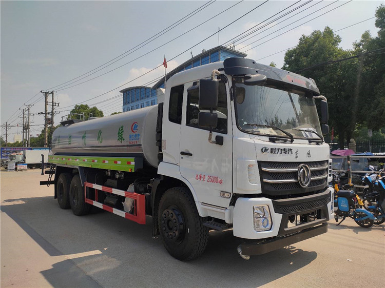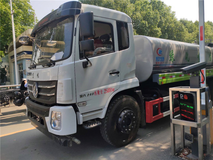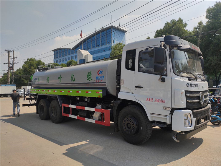 湖北程力國六東風錦程V6后雙橋18噸灑水車程力威牌CLW5253GPSD6型綠化噴灑車廠家配置: | 湖北程力國六東風錦程V6后雙橋18噸灑水車底盤配置:采用東風后雙橋原裝底盤,東風錦程齊星軍工V6四點懸浮駕駛室,4350+1350mm軸距,搭載國六(國Ⅵ)東風康明斯230/260馬力柴油發動機,功率169/191kw,國六排放,陜齒法士特八檔變速箱,11.00R20鋼絲胎,前橋5T,后橋雙10T,方向助力,斷氣剎,排氣制動,原裝空調,行駛記錄儀,多媒體顯示屏,電動門窗,中控鎖,氣囊座椅,ABS。湖北程力國六東風錦程V6后雙橋18噸灑水車專用配置:罐體容積:19立方米,罐體鋼板為4mm碳鋼Q235材質專用容積板一次成型,罐內隔板具有防波作用,以減輕汽車行駛時罐體液體沖擊;配大功率專用灑水泵,泵可自吸自排;整車前沖、后灑、側噴、后平臺帶綠化灑水炮,灑水炮可全方位旋轉,可連續調成直沖狀、大雨、小雨、毛毛雨;前封頭帶水位計,后平臺主管路帶1寸澆花接口,后爬梯,帶1個消防接頭,帶1個自流閥,1個過濾裝置。湖北程力國六東風錦程V6后雙橋18噸灑水車選裝配置:1、可選裝氣動球閥開關駕駛室內控制; 2、可選裝后平臺帶CLW-30、40型霧炮機組